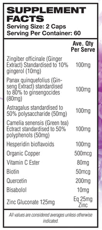 Ginger Extract (std. to 10% gingerol), Ginseng Extract (std. to 80% ginsenosides), Astragalus (std. to 50% polysaccharides), Green Tea Extract (std. to 50% polyphenols), Hesperidin Bioflavonoids, Organic Copper, Vitamin C Ester, Biotin, Quercetin, Zinc Gluconate.